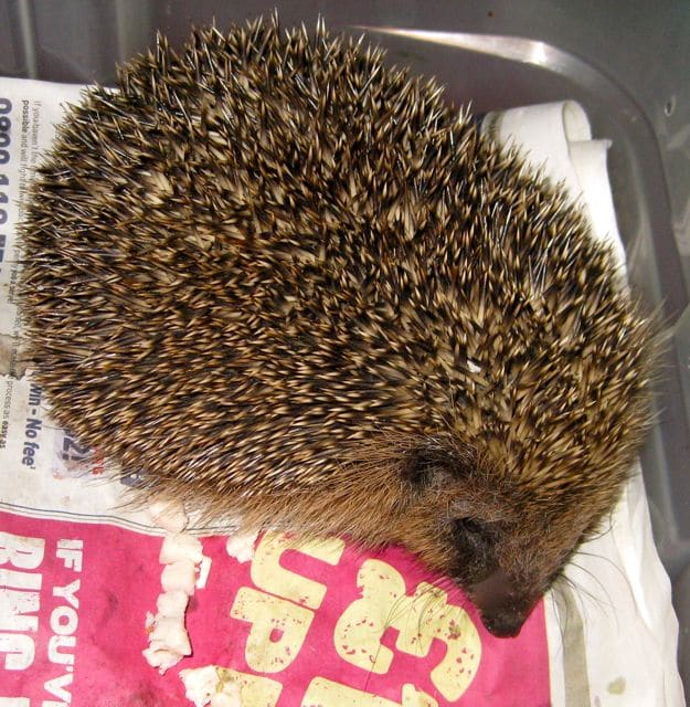 We don’t know how it happened. Although he is obviously in shock he has eaten some mealworms and had a little drink of warm goat’s milk. He looks to be just about full grown so would normally be ready to hibernate. We don’t want him to do this yet as he needs to heal up and increase his weight – he is a bit thin, possibly because he couldn’t get food for himself so easily after he was injured.