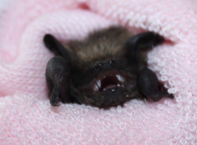 Boris the baby bat is doing well, he’s feeding with enthusiasm and takes milk every couple of hours. When he’s ready for feeding he squeaks to us! It’s amazing how he responds and communicates. Already he has likes and dislikes. When he’s been fed he settles down and likes to be snuggled in a fleece, nice and cosy. When he’s hungry he climbs out and wants to be held. He won’t feed unless he can wrap round a finger, he likes the feel of skin when he’s suckling.