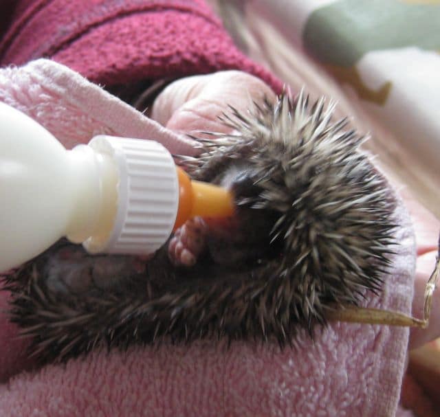 It’s like having a baby! Or rather five of them all at once. The baby hedgehogs need feeding every two hours at this stage but it is getting easier. At first they were so frightened it took a while to get them to relax and uncurl so we could try to feed them. Now it’s a lot better. They are getting used to being handled and will stay uncurled – they like to have their tummies tickled too!