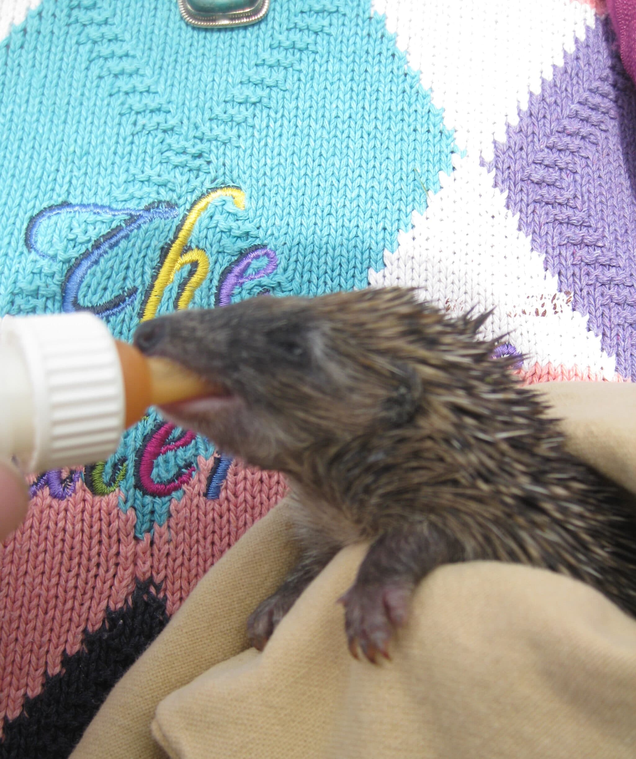 The hoglets are still having their bottle feeds every two hours……zzzz……zzzz – perhaps a bit longer space in between feeds in the night, they are sound sleepers but always hungry when they hear me coming to feed them. The three largest, Biggie (shown here) Huffie and Woody all have their eyes open and are eating solid food as well. Not chunks but pureed cat food – they love it. They have a bottle first and then a saucer of soup-consistency chicken. The two little ones, Pearl and Minnie, aren’t making the same progress, they are less active and haven’t made the same growth. There’s such a gap in size between them that I’m going to separate them and give the little ones extra care. Fingers crossed, prayers please.
