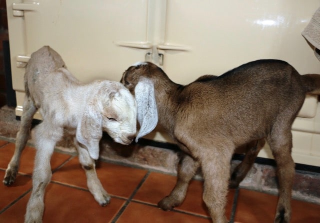 Only a day old and already on their feet, although these baby goat kids are still a bit wobbly. When their mom Buffy gave birth this week she had two kids fairly quickly and normally that would be it. But Buffy hadn’t finished and within half an hour had another two kids. It’s unusual for goats to have four kids and of course, it presents a problem – goats have only two teats so how would they all manage to suckle?