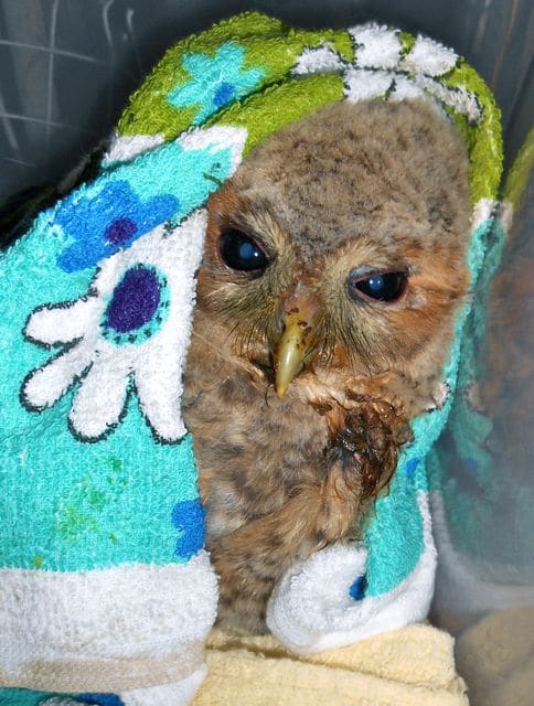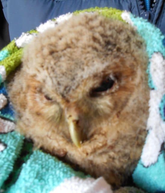 This frail baby owl was brought in today and was looking very weak when he first arrived. He was found by a kind hearted lady who saw him on the groound and at risk from predators. When baby owls are not moving around it’s usually because they are unwell or too weak to escape. We don’t know how long he had been there. If baby owls are in good condition they should be put on the branch of as tall a tree as you can manage or on a high ledge. Mum will find them and come and feed her baby no matter where he is, they don’t have to be in a next.