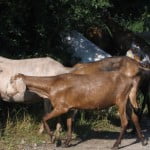 Goats are valuable animals, they can turn unusable scrub ground into delicious milk and with supplementary feeding will provide enough to rear their kids and some left over for the household. Goats are in kid for five months and usually manage their kidding without help. They need a clean shed with plenty of straw and some privacy. This is the one time when the goat will want to leave her friends and be on her own. Goats are wonderful mothers and we think it’s unkind to take the kids away when they are born. Some people do this because they don’t want them to suckle as they want the milk. We like to leave kids with mum so she can fuss and nuzzle them. If we want to bottle feed them we make a small pen in a corner and put them there so mum can still fuss them. Bottle fed kids are very tame, those reared on mum are less so.