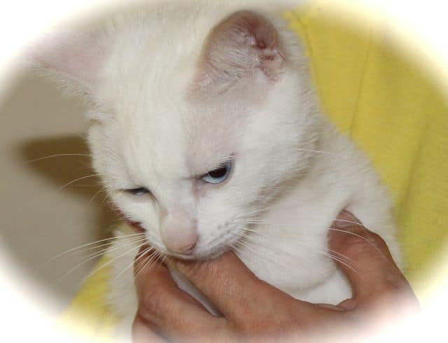Sky is a lovely friendly young cat and it’s no surprise that she has already found a loving home. It was important for her to go to someone who understands the special needs of a deaf cat. Sky can’t hear a thing and like many other pure white cats, she is completely deaf. The lady who has taken her is used to having a deaf cat and knows that Sky can’t ever be let outside on her own.