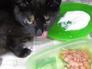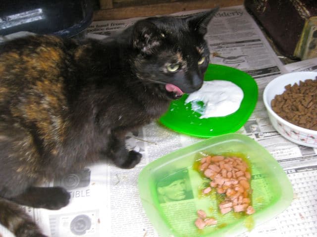 We found this little cat in a box on the car park yesterday. It was sellotaped up but had air holes in it so we knew it wasn’t jumble. She is a tortieshell and very pretty – not microchipped but friendly although a bit shy and understandably nervous. Although she is so young and small (hardly more than a kitten herself) she looks to be pregnant with a suspiciously bulging tummy. Is this why she was dumped? She was starving hungry and tucked into a pouch and a saucer of goat’s milk yoghurt right away. Yoghurt is very good for cats and is a pick-me-up when they are a bit frail or recovering from an illness. (But don’t give cow’s milk or yoghurt to cats or dogs as they can’t digest it so well and sometimes get tummy upsets).