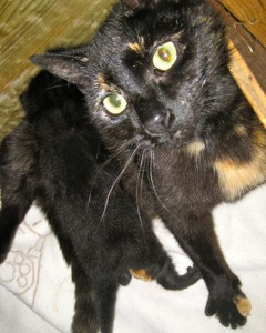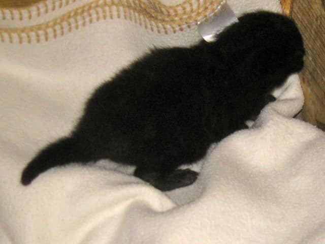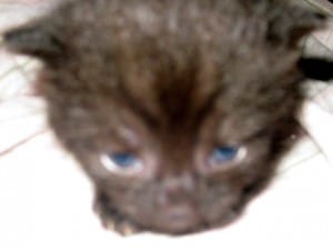 He’s his mommy’s blue-eyed boy! Very difficult to take his pic – all he wants to do is snuggle up to his mom. He is jet black all over even his tiny paws. Maybe that’s his name – Jet?