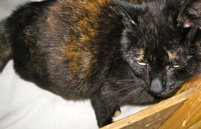 Cassie and her one kitten are doing fine. This young tortie mum has gone from ‘shock/horror’ to ‘fussy/mummy’ in a matter of days. She is so excited about this kitten and can hardly keep still when she’s showing him off. Cassie is a very agile, quick little cat, not much more than a kitten herself, and she wriggles and gets up and down and is so pleased with her baby. She is ready to nurse him whenever he wants – he’s getting all the milk and growing fast.