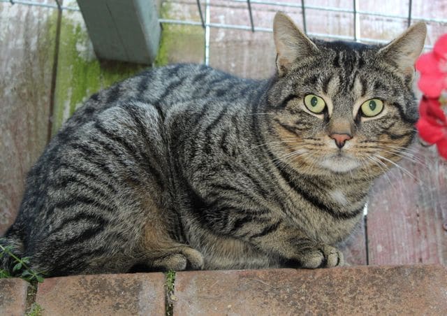 He’s a fine looking cat but this male tabby has problems. He was brought in to us after being found as a stray. He’s thin and on the defensive, he needs neutering and vaccinating. He comes out to eat but doesn’t want anyone to touch him – it’s swipe with his paw if you try! His tail is missing and it looks like an injury that might be recent. We’d like to have a closer examination but there’s no chance at the moment. Cats are definitely more difficult than dogs if they don’t want you to do anything.