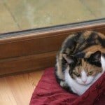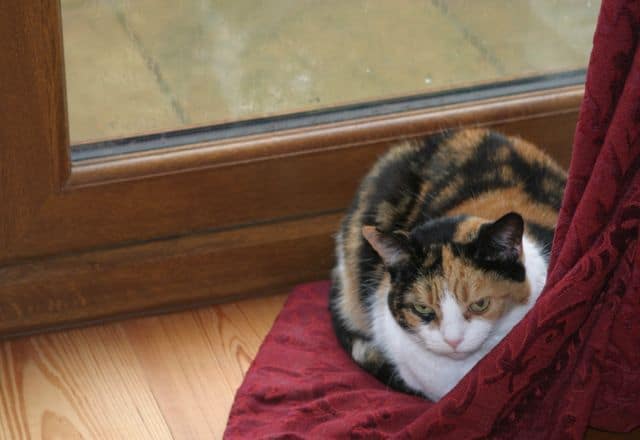 Tortie likes to be outside except when it rains and then, like most cats, she dashes indoors. She’s found a good spot – on a curtain behind a double glazed window, it’s cosy and she can watch the raindrops. Tortie’s eye has healed up completely now. At first it looked as though it was badly infected but the vet discovered a huge abscess on a back tooth which was causing the inflammation. Extracting the tooth and draining the abcess cured the eye. Sometimes injuries and illnesses are not what they seem at first. We could have gone on treating the eye forever but it would never have healed. Thanks to Spire Vets for getting Tortie right again.