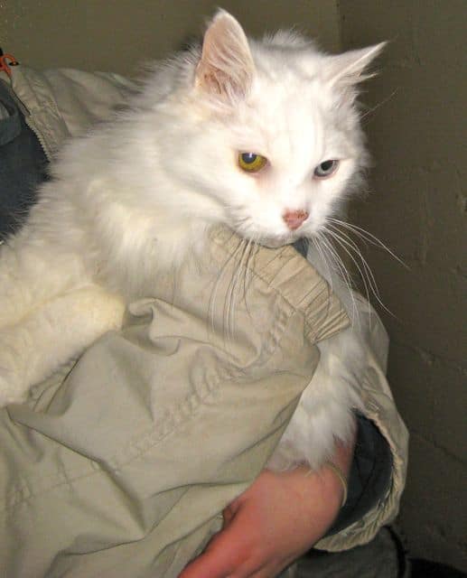 Pebbles doesn’t like her routine being changed and was very suspicious of meeting the vet. We fussed and coaxed her though and she soon thawed, not quite purring but fairly laid back about being examined by a stranger. Pebbles was found to be in good health and the vet estimated her age at between 10 and 12 years. Her beautiful eyes, one bloue, one golden, were commented on and Pebbles was vaccinated before she realised what was happening. She does has a very knotted coat and resents being groomed – as most cats do when the knots have been there a long time and are close to the skin. The vet decided to leave dealing with them till the warmer weather comes. We’ll keep teasing and cutting them out without causing Pebbles any stress when we can.