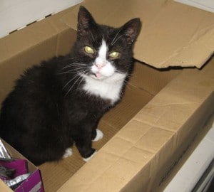 Big Tom is one of these. (He’s been neutered by the way) He arrived several years ago and was a real ‘wild one’ to begin with and a proper ‘tom’. Eventually he mellowed and now is a real softie. What is it about cats and carboard boxes though? As soon as Tom sees one, he’s in. If anyone would like to give this genial old stager a home, please come and see him and have a chat with us. Tom wouldn’t mind being an indoor cat as he’s become quite sedate – he does like companionship and long chats while he’s sitting on your knee though.