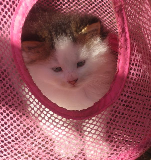 Most kittens are a bit clingy when they are this small (four weeks) but this is a confident little fella with an adventurous personality. He’s a mommy’s boy when it’s time to nurse and then, when he’s had a cuddle, he’s off – climbing, roaming and playing with youngsters who are ten times bigger than he is.