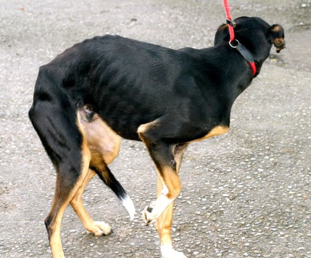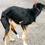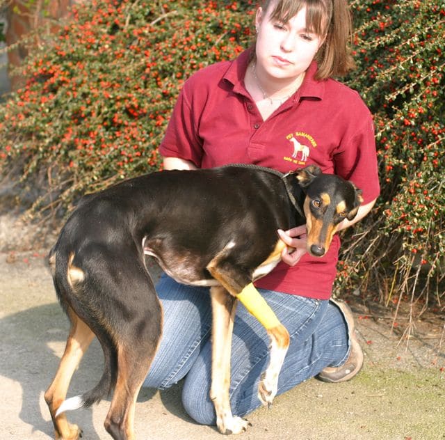 Delboy was wandering about the streets late at night in a suburb of Chesterfield. He was emaciated and, even worse, had a dreadful injury to one of his front legs. There were people still around and he had to decide which way to go to for help. Delboy made the right choice – he followed an off-duty policeman all the way to his home. Clever dog. The kind hearted officer took him in, gave him food and first aid and then brought him in to us.