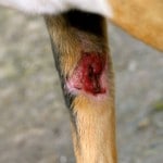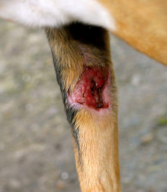 Delboy was one of the thinnest dogs ever but his leg was the most immediate problem. The wound is on the inside of his front leg, it’s large and deep, right down to the bone and it’s very painful. This injury didn’t happen yesterday, it was neglected and infected. The vet put him on antibiotics and, short of skin grafts, it was up to us and lots of care and t.l.c.