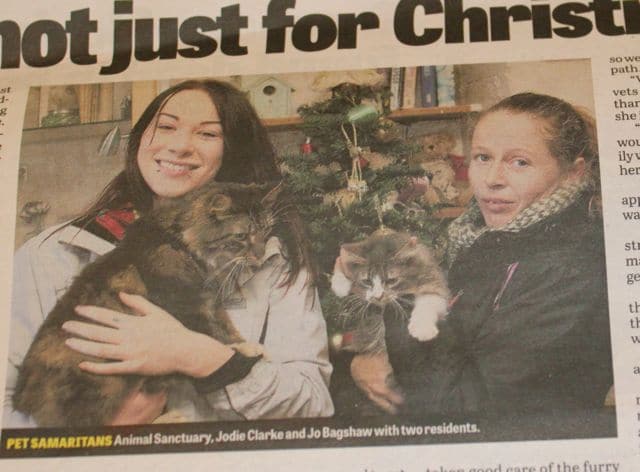 ‘Cats are not just for Christmas’ is the headline in today’s Derbyshire Times – it’s a feature about the dozens of stray cats who have been brought in or dumped here in the run-up to Christmas. The photo shows volunteer Jodie (on the left) with Leo (a Maine Coon) and Jo, who is a Sanctuary Manageress and also Adoptions Co-ordinator.