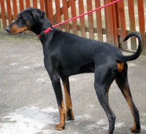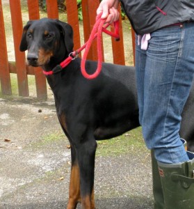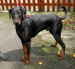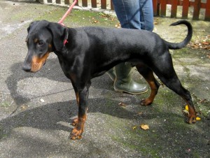 Mr. Big is very good natured and likes a lot of fuss. He needs lots of exercise and loves to play and fetch sticks and balls so his new people need to have plenty of time for him and like walking. Biggie has a nice smooth coat with the typical Doberman black and tan markings and he keeps himself very clean. He’s been neutered already and while he’s been here he’s been great with the other dogs he’s met. He’s a lovely dog and one who will make a faithful friend forever for some lucky person. A little bit more training would be of benefit – no, don’t jump up Biggie! When he does, he’s as tall as we are!
