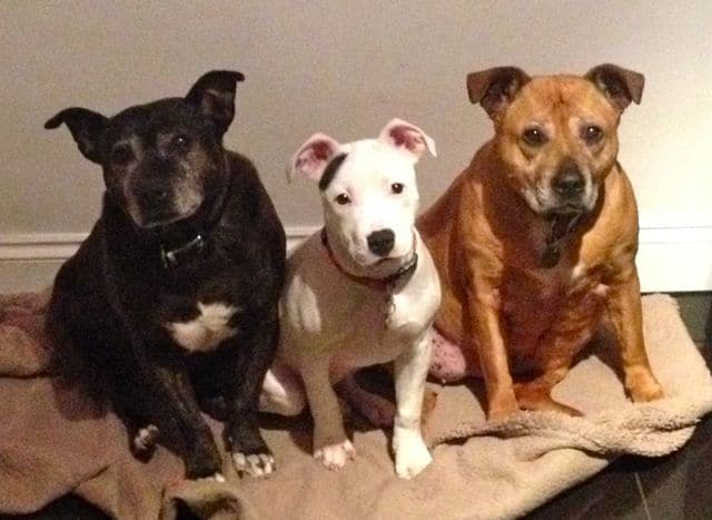 A happy ending for Staffi puppy Ella who came in to the sanctuary last year- not only has she a fabulous new home but she has ready made friends as well. Ella loves her people just as much as she loves her new doggy family. Isn’t this one of the best pictures ever? Thsnk you so much to Justin for sending it to us. Your dogs look fantastic and are a real credit to you.
