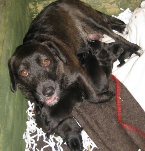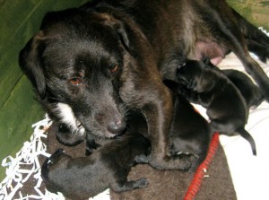 Rosie is a natural mother and loves her babies, although she does look a bit stunned – ‘where did this lot come from?’ She is nursing them carefully and they are all an even size, it’s always a worry when there is a ‘runt’ but this is not a problem with these little ones. What do they look like? They take aft er their mommy – the three boys and two girls are miniature versions of Rosie. They are all dark smudgy brown with white feet and tips and small flashes on the head.
