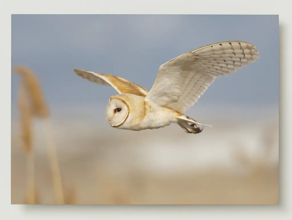 Quote on reverse “With silent wings, the Barn Owl glides, a ghost in the moonlit sky”