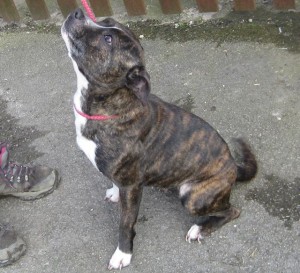 Gina is a staffi stray who, like most staffis, loves food. She is easy to train because she’ll do almost anything for a titbit. Not that she is pushy or greedy, she takes her treats politely and then says ‘one more, pleeeze!’