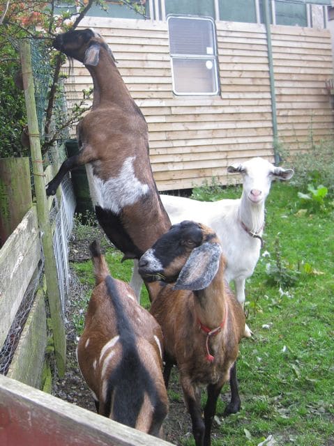 They are browsing animals and want to be on the move all the time – the grass is always greener over the horizon for Miss Goat. If you live in an area where they can run free and do as they please all day, you will find that they come back home at night or when they are ready for a siesta. Goats like to lie down and chew the cud at regular intervals and prefer to do this close to home, so they like to come and go as they please. Goats will also dash for home whenever rain approaches. They hate rain and will run back to their shed whenever they feel the first spot. In America there is a goat weather station, where a goat farm is opposite local radio. Apparently they base the weather forecast on what the goats are doing! I am sure this will be as accurate as any other forecast, goats are good predictors of the weather. Keeping goats free range is the most ideal system, for them and for you. The trouble is that most of us have boundaries, fences, neighbours with gardens and once your goats have explored and eaten all the goodies on your patch they will want to move on. Fencing to keep a goat in has to be up to jailbreak standards! Miss Goat can go under, over, through and she is clever enough to open gates and untie latches and fasteners. The fencing has to be safe too or there will be broken legs and torn udders.