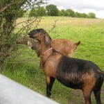 It’s all about food – goats want to get out to find fresh food. They are pernickety eaters, always searching for a fresh and tasty morsel. Their desire is to eat deep-rooted plants and a grass field doesn’t suit them. Woodland or scrub land is what they like most of all. If the trees are mature they usually leave them alone, they will strip all the saplings and young growth however. Goats eat most bushes, vegetables and flowers, they adore roses and although they only have one set of teeth (on the lower jaw) and a soft palate on the upper jaw, they will devour the whole stems thorns and all. I watched the goats grazing earlier in the week. I had them out for an early evening stroll – first they attacked the hawthorns, then some dandelions and docks, then elderflower branches, then grass, then nibbled at some low hanging larch, then grass, then finished up devouring some sycamore saplings. They were obviously contented when they ambled back to their goat house. This was a perfect goat supper and one they particularly enjoyed because they had a goat herd out with them – me!