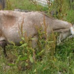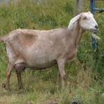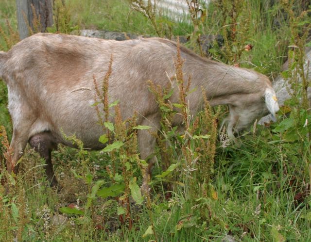 We gave Biscuit bulky high fibre food after she’d kidded, something to fill her up but not high in protein or anything that would create too much milk. She enjoyed a nice bran mash, also some alfafa, lots of apples and carrots and just a sprinkle of oats. We’ll introduce her proper goat rations as she makes more milk. There is always a rack of clean, sweet hay for her to nibble when she feels hungry. The best food for her is natural browsing and just outside her shed there is a patch of rough ground full of docks, thistle, nettles, small bushes and coarse grass – goat heaven!