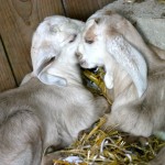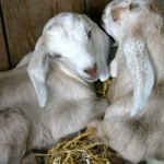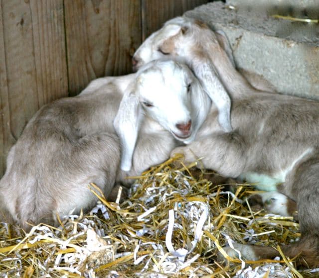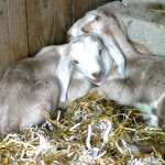 Biscuit’s kids are doing well and love to snuggle up together. They are suckling milk from their mother but when they are not feeding they spend most of their time asleep. At this stage, only days old, they have a lot of growing to do and while they can easily stand and follow mum around, they soon get tired and down they go for another siesta. Biscuit is very careful with them, at first there was a mix-up over who was nursing from which teat – they both wanted the same one! But now that’s all sorted out and they both go for their milk together. When a goat is newly kidded she will need careful attention until her udder has ‘settled down’. The act of giving birth makes her produce lots of milk and it’s sometimes too much for the kids to handle when they are so small. The danger is that her udder will become swollen and tender if they are not taking enough milk. Then it will hurt and she won’t want them to suckle. Mastitis is the ever present danger and must be avoided at all costs.