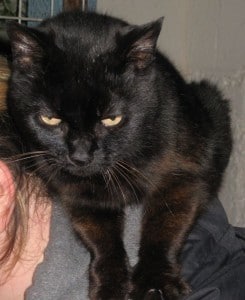It took a while but eventually some wonderful people came along and Molly loved them right away – she has gone to her new home and has settled well – being thoroughly spoilt which will suit her just fine. Thanks folks. Molly is a middle aged lady cat who came in to us recently and who is looking for a loving home. She is a survivor and has her own ‘support group’ of kind people who have helped her over the years when she was homeless. That so many people are fond of her and keep in touch and come to see her, is a testament to her lovely nature and affectionate character. Molly likes to be with you and have a lot of fuss, she is as good as gold to care for and is a very clean cat. She is small and neat and dainty and has an especially endearing characteristic – she likes to sit on your shoulder! Molly is very gentle though and is quite a feather-weight so it is no problem. If you’d like to come and meet Molly please get in touch. We would be especially delighted to find this sweet feline lady a new home – could anything be nicer than a fussy and friendly lucky black cat??