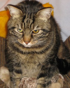 Toby is another mature cat who has a more reflective nature than Molly. He is just as affectionate though and is very well behaved. It’s good that he doesn’t try to ‘shoulder-sit’ – he is a bit too heavy for that! Toby was a bit overweight when he came in and had been the much loved pet of an elderly lady who unfortunately had to go in to hospital and so could no longer care for him. He is a lovely chap, neutered and vaccinated and very clean in his habits. Toby is a handsome cat, still on a weight-watchers diet though. He’s a big lad and very round and comfy – his eyes are lovely – large and limpid and slightly different colours. Toby is very affectionate and would love to have a new home .