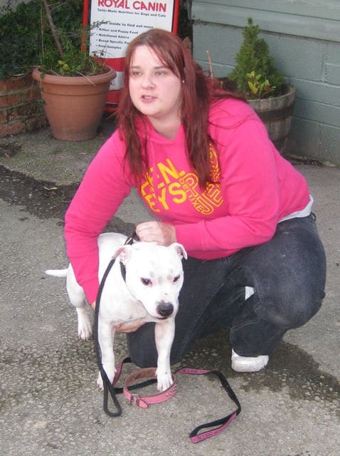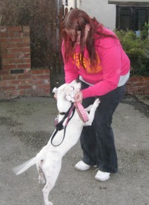 ‘I am so pleased to see you!’ Mr. Softy’s original owner and breeder found her dog again after checking in to our website. She was over the moon to recognise her dog who is actually called Dax. When she came to fetch him we all agreed that Mr.Softy suited him just as well – just look at that tail wagging. All the time this dog was with us I became convinced that he belonged to someone special and was trying to tell me all about it. If only we could communicate better. Dax was overjoyed to see his ‘mum’ again and Melissa has no intention of parting from this fantastic staffi ever. Happy endings – it’s what makes it all worthwhile.