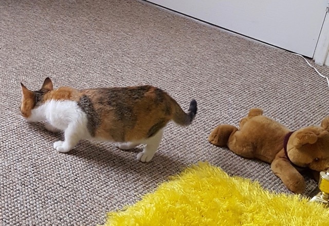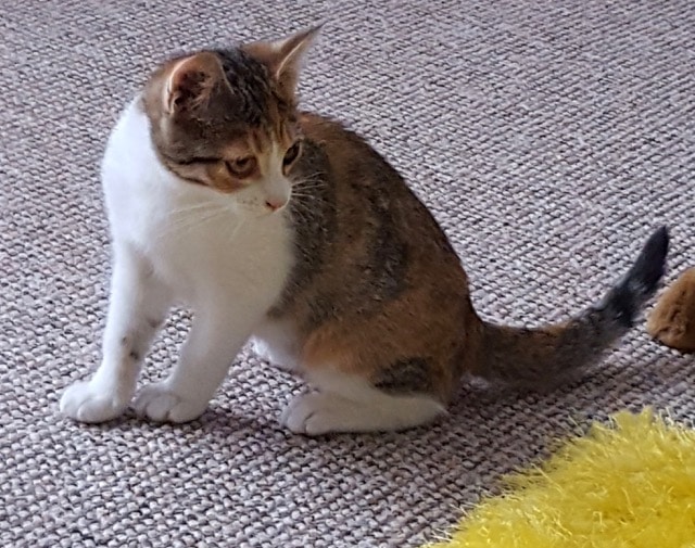 This is Mittens, a very pretty calico young lady, who has been adopted by Sue and Brandon. We’ve heard that she is settling well and enjoying life in her new surroundings. She even has a teddy bear! Thanks for the update and photos, please keep in touch, we love to see photos of our kits when they are all grown up too.