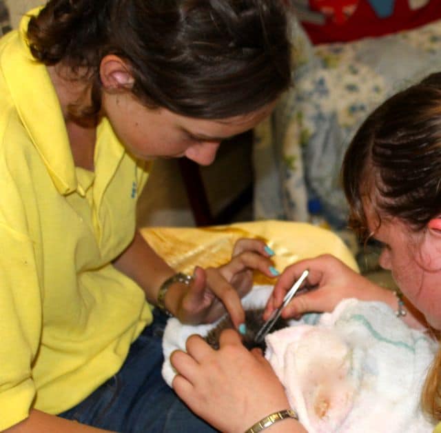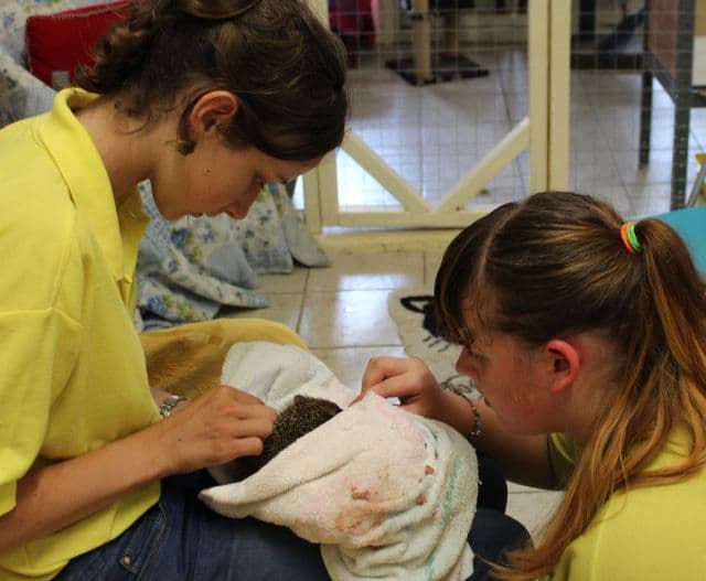 Sharp eyes and nimble fingers needed to get the ticks and maggots off this tiny hoglet. Well done, girls.