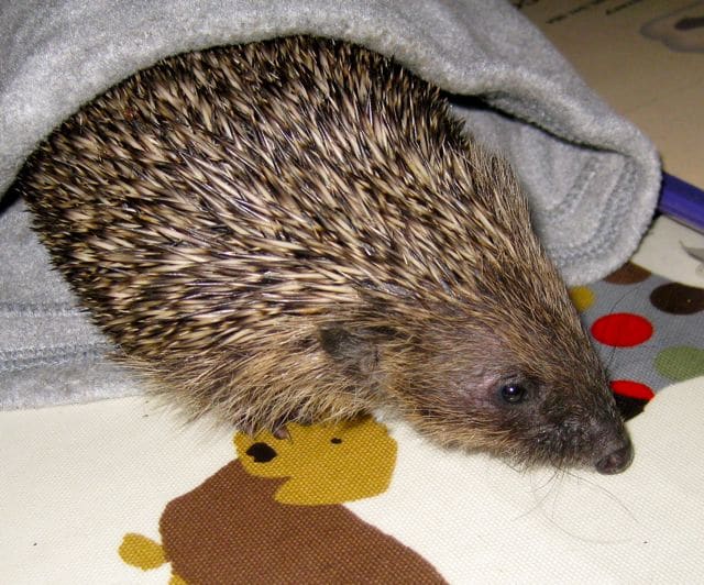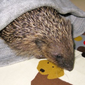 Biggie is one of the baby hedgehogs we bottle reared – he was such a tiny tot but just look at him now. He still likes to be petted and likes to find somewhere snug to have a snooze. A fleece beanie hat made the perfect nest and when he found it he was straight inside. Just the right size and very cozy!