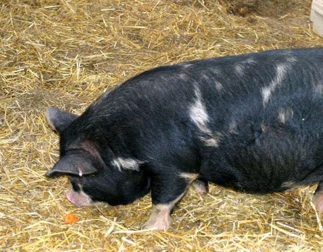 The first minutes in a new pig pen are crucial. There’s a deep bed of straw in one side (pigs love their comfort) and a concrete run or, even better, a nice grassy paddock outside. You need to keep him in the place you’d like him to use as a toilet (outside and away from the straw) until he’s actually done the business. Once he’s marked the spot, that’s it, he’ll keep coming back to it and the rest of the area will stay clean. Keep the board in front of him and feed him if you have to, scratching his back and having a chat with him for as long as it takes. Then you can leave him to it – he’s housetrained and will always use the same place. Instead of ‘mucking out’ the whole area as you would have to do with a horse, cow or goat, you’ll just have to scrape the manure from one place. The bedding will always stay clean. Our sanctuary pig, Pugwash, has a nice bed of straw, it’s always clean because he goes outside to the toilet. Good boy Pugwash. Pigs – dirty creatures? I don’t think so – they won’t sleep in a soiled bed – unless the factory farmers give them no option. [donate]