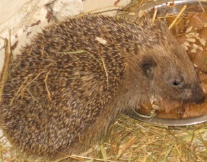 Yesterday was a ‘magic moments’ day though – it was when little Robin finally learned to trust us – when we put his food down he came straight out for it and then scampered over to say hello. Even with only three legs, hedgehogs are quick and nimble. It may be that his leg doesn’t hurt any more or perhaps just that he associates us with food – but Robin (a three wheeler!) is now best friends with us. He likes us to stroke him and will take food from our hands. He’s interested in everything but only for a while and then it’s back to his hay den to sleep it off.