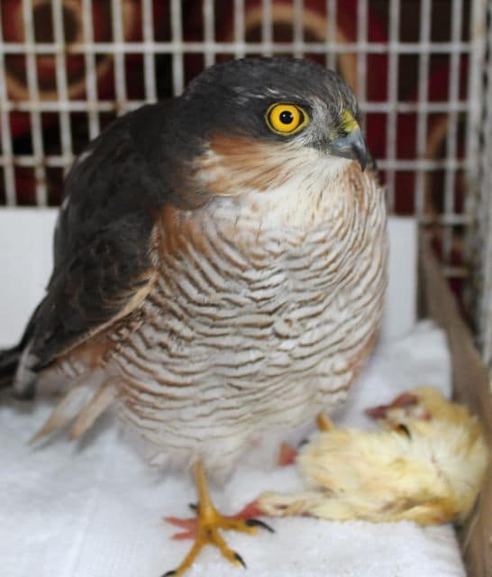 This beautiful bird was brought in to us yesterday. She is a sparrowhawk and has an injured wing so she can’t fly. We think she is a youngster and a female (they are larger than the males) – a sparrowhawk is a challenge to rear and care for. They are very nervous birds have to be kept quiet and not stressed in any way. So far she hasn’t taken any chick but has had a sliver of raw meat overnight so that is something. They are used to eating small birds or mice so we’ll try a ‘pinkie’ (baby mouse) later on today.