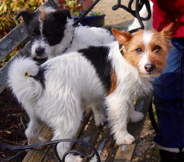 Basil, the tricolour on the right, and Badger the black and white fella on the left, are best friends so that is good news. It’s not unusual for J.R.s to be jealous but there is no sign of it with these two. Basil, who is a year older than his little pal, is protective and caring. Badger is a bit nervous of other dogs (after an encounter with a macho man) but Basil gives him a lick and a fuss if he hangs back – ‘come on then, you’ll be alright’. It’s lovely to see them interact so nicely with each other.