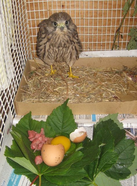 Kes is eating well and staying wild which is what we want most of all. When he is released he will have to fend for himself and hunt for his food. At present he is having raw meat and an egg every day which he enjoys. Keeping everything as natural as possible is the aim. He is keenly interested in his food and although he doesn’t eat while we are around, he eats it up as soon as he is on his own. We’ll be making the transition soon to more natural food. If he takes that it will be a very good sign. Leaves make good plates1