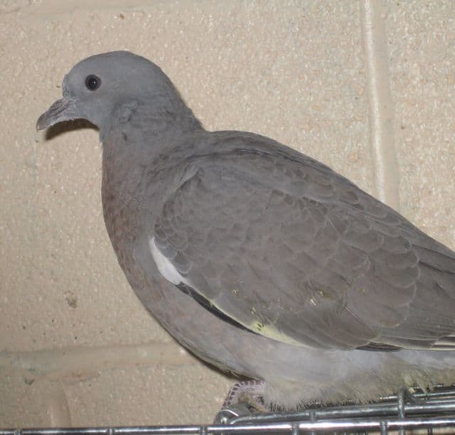 This young pigeon was found with injuries to her leg which meant she couldn’t walk or fly. Her rescuers brought her in to us (thanks folks) and it did look bad at first. Her leg wasn’t broken but she could barely stand. She had been put in a cat basket which is ideal for an injured bird, it’s a small space so she couldn’t move around much and injure herself further. Also it’s a low light level in there which is soothing for a bird in shock.