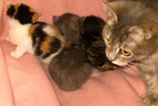 Paris’ kittens are doing well, they have their eyes open and are moving around although not ready to leave the nest yet. Paris is an attentive mum and keeps a close eye on her babies. We were going to have her spayed and re-home her when she first came in. Her plump tummy made us hesitate. It’s always best to wait and see with stray cats – and so glad now that we gave her the chance to have her kittens. Not every cat is a good mother but Paris certainly is.