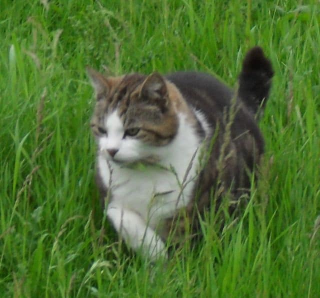 This wasn’t an even litter, three were biggies and the other two were smaller, one especially so. We don’t have the kittens vaccinated until after 9 weeks and when they’ve had their health check they are ready to pack their little bags and go to their new homes. If a kitten is a real tiny we’ll keep her a while longer though. We don’t like them all to go at once because it’s stressful for mum too. Eventually she’ll not bother about them and that’s when they can all leave. Although, sometimes if a cat has an especial attachment to one of her kits we’ll let that one stay with her for always.