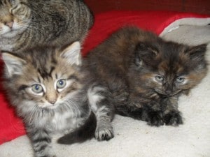 Our first born kittens are nearly six weeks old now and venturing away from mum more and more. You can see her smiling in the background.She doesn’t seem to mind now so long as she knows they are within meowing distance. The little boy on the left is a lovely silvery tabby and has already been reserved. The kitten on the right is definitely a little girl – she’s a tortie and they are always female. Both the kittens are already litter trained and eating well, still suckling from mummy whenever they can though!