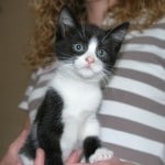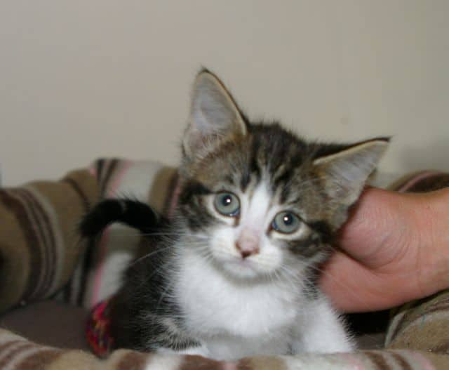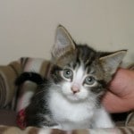 Tinkerbell – is a girl kitten with a very sweet nature, this little poppet is not boisterous at all but is gentle and likes cuddles and to be nursed. She has beautiful markings, tabby and white with touches of ginger round her face. Tinkerbell has just been vaccinated and is fully litter trained. She’s ready for adoption now so please come and meet her if you are looking for a kitten.