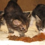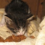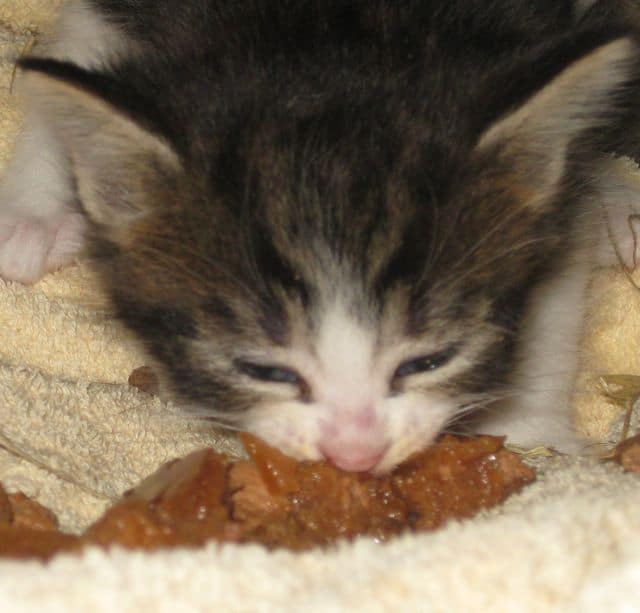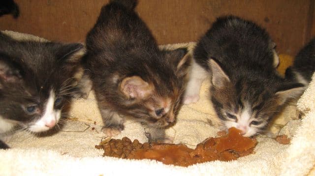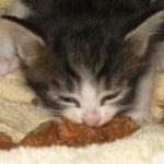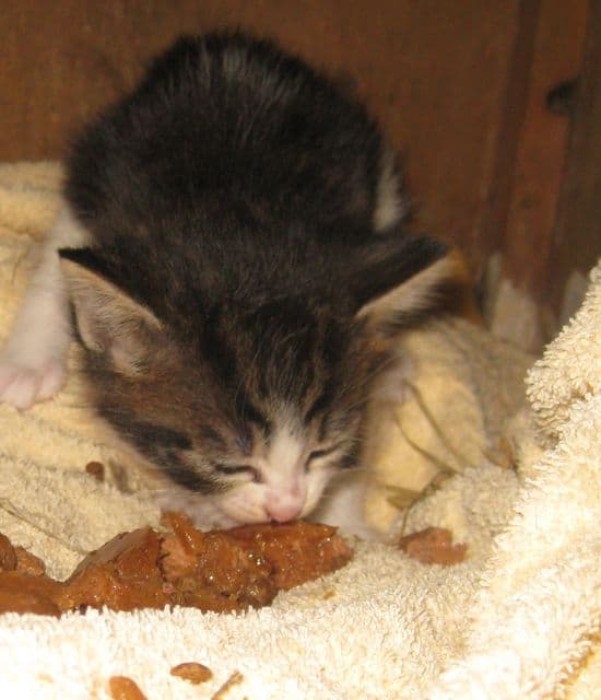 He eats with lots of determination – it must be a good feeling to be full now he has learned to feed himself. Mum comes to eat when the babies are finished and she nurses them as soon as we move away. This is how wild cats live and the smaller the litter and the more feisty the kitten, the better the chance of survival.