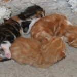 As soon as Tilly has reared her babies we’ll have her spayed so she will not have to worry about anything maternal again. We’re giving her lots of nourishing food and keeping her very quiet – no visitors till she settles a bit more. The kittens are not evenly sized, the calico is the biggest, then there is a medium sized ginger tabby with a touch of white, the all ginger tabby is the tiniest of them all – a real little scrap of a kitten. I love those little pink paws!
