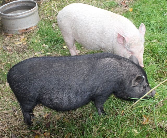 The light coloured one is Pinky and his sister is Perky. They are both friendly and have charming personalities. Pigs like to stand and chat, they are very good companions and these two are no exception.
