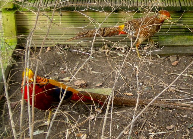 The girls are identical – neat and sweet and much more adventurous than the boy. Hopefully they’ll soon make friends. Golden pheasants are ground living birds who originate in China. They like to hide in the undergrowth and only roost at night. Will they all get along? We do hope so.