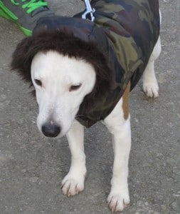 It was really cold when Louie came back to see us at the weekend but that didn’t bother this great little Jack Russell because he was wrapped up warm in a camo jacket with his hood up. No frozen ears for this little dog! Short coated dogs feel the cold when they are on the lead or standing around, it would be different if they were free and running all the time. A coat helps maintain their body heat and makes them feel more comfortable. There was no doubting how much Louie liked his coat and furry hood.