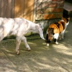 From a very early age they can climb and have a great sense of balance – they are very surefooted (climb like a goat – yes that’s true) if there’s a wall around, they’ll be dancing about on the top of it straight away. The female goat is in kid for five months, normally she’ll come in season in the autumn and winter months and give birth in the spring. Buffy and Bafta are anglo-nubians, a breed originating in hot countries and they are a bit different to the swiss breeds, they come in season all year round. You will easily tell when a female goat is on heat because she will start bleating very loudly (and sometimes non-stop), also she’ll wag her tail and her vulva will be pink and inflamed looking – that’s it she’s ready to be mated. The season only lasts a few days, miss taking her to stud and you’ll have to wait another three weeks.